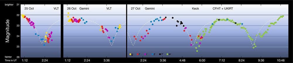 Iz kombinacije slik z Zelo velikega teleskopa in ostalih observatorijev, ki so opazovali asteroid, so astronomi z Inštituta za astronomijo na Havajih ugotovili, da `Oumuamua močno spreminja svojo svetlost. Ko se enkrat zavrti okoli svoje osi v 7,3 urah, spremeni svojo svetlost za kar desetkratno vrednost. Takšna nenavadno velika variacija v svetlosti objekta pomeni, da je asteroid po obliki podaljšan, kot nekakšna cigara. Njegova dolžina je ocenjena na 400 metrov in znaša kar desetkratno vrednost njegove širine, hkrati pa ima asteroid tudi zelo kompleksno in zavito obliko.