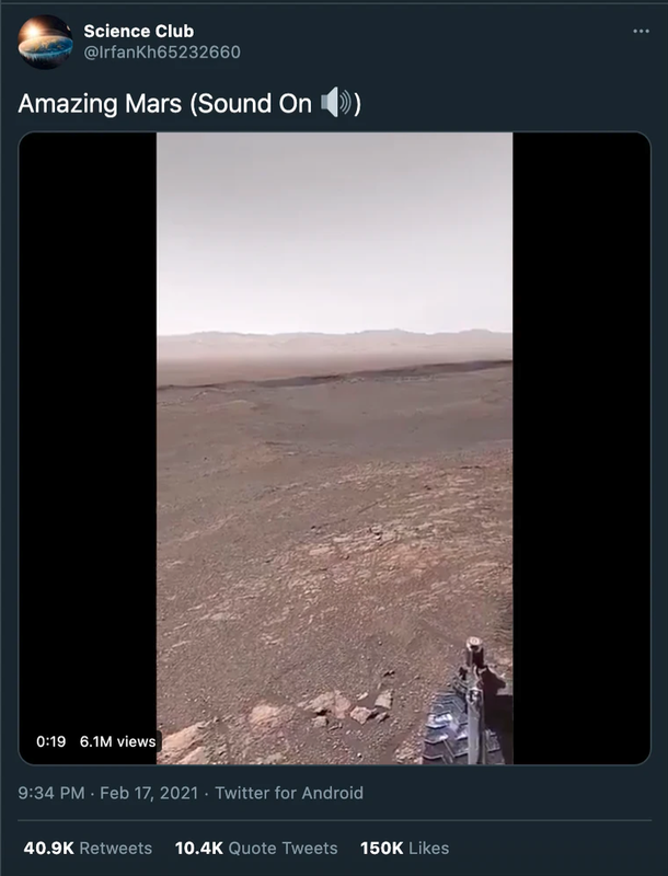Lahko si predstavljate, kako so se po objavi viralnega nepristnega videa počutili znanstveniki, ki so deset let delali na roverju Perseverance. Le nekaj dni, preden bi objavili pravi (in po vseh standardih je šlo za neverjeten in prelomen) video, je nekdo z goljufijo zmanjšal vrednost njihovega dela.