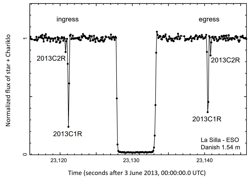 Asteroid 10199 Chariklo je predstavnik družine Kentavrov, to je asteroidov in kometov, ki se večinoma nahajajo med Saturnom in Neptunom. Leta 2013 so astronomi v Južni Ameriki lahko opazovali asteroid potovati preko svetle zvezde. Pojav imenujemo okultacija. Chariklo je po pričakovanjih za trenutek potemnil zvezdo. A to ni bilo vse—v opazovanjih so se pokazale dodatne kratke potemnitve. Svetlobo je torej poleg asteroida samega blokiralo še nekaj drugega.