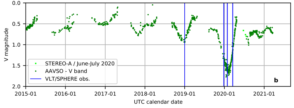Astronomi so v novi raziskavi pojasnili lanskoletno skrivnostno potemnitev zvezde Betelgeze. Za potemnitev sta bila odgovorna plin in prah, ki ju je zvezda v vesolje odvrgla dobro leto prej. Rezultat nas uči, kako masivne zvezde v zaključnih stopnjah razvoja izgubljajo maso. Obenem Betelgeza odstira procese nastajanja prahu v vesolju.