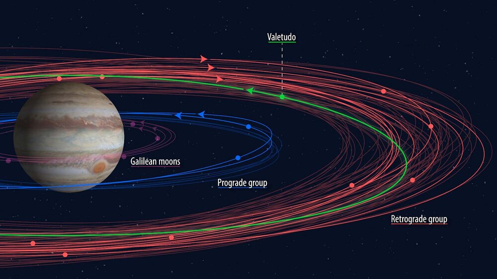 Med Galilejevimi lunami in progradnim pasom je precej velika praznina z eno samo znano luno, to je luno Temisto. Za progradnim pasom je zopet večja praznina, nato pa pridemo do zunanjega retrogradnega pasu, v katerem se lune gibljejo v nasprotni smeri vrtenja Jupitra. No, v notranjem delu retrogradnega pasu je ena luna, ki se giblje progradno, in sicer luna Valetudo.