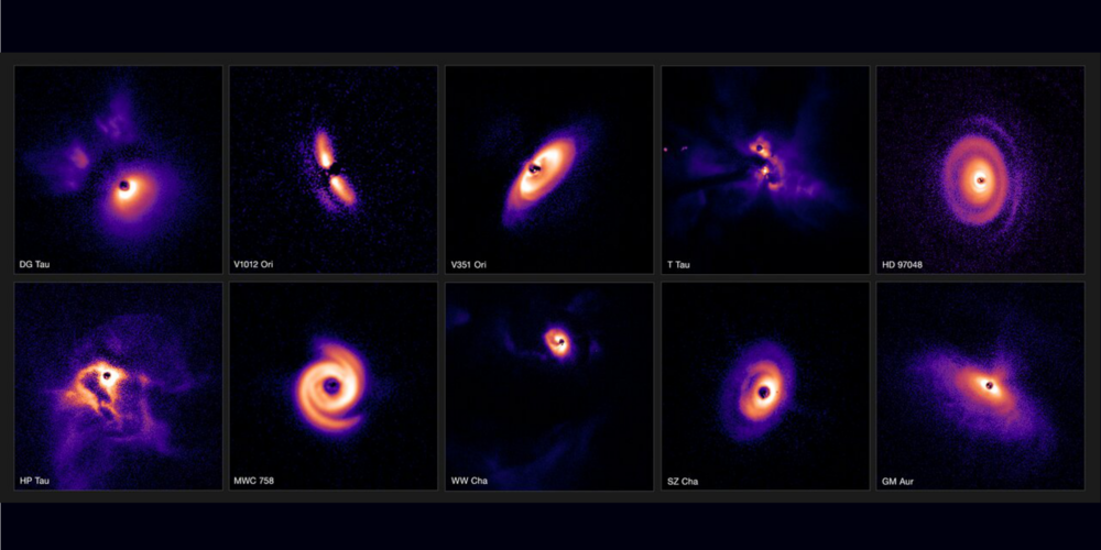 Naslovna slika: Izbran nabor protoplanetarnih diskov iz najnovejše študije. Zvezd v središču diskov na slikah ne vidimo, ker so bile med opazovanjem prekrite. Diski imajo na nebu sicer različne velikosti, za to sliko pa so bili ustrezno skalirani, da izgledajo podobno veliki. Zvezdi V351 Ori in V1012 Ori se nahajata v meglici Orion. DG Tau, T Tau, HP Tau, MWC758 in GM Aur ležijo v molekularnem oblaku v Biku, HD 97048, WW Cha in SZ Cha pa v Kameleonu I. Avtorstvo: ESO/C. Ginski, A. Garufi, P.-G. Valegård et al.