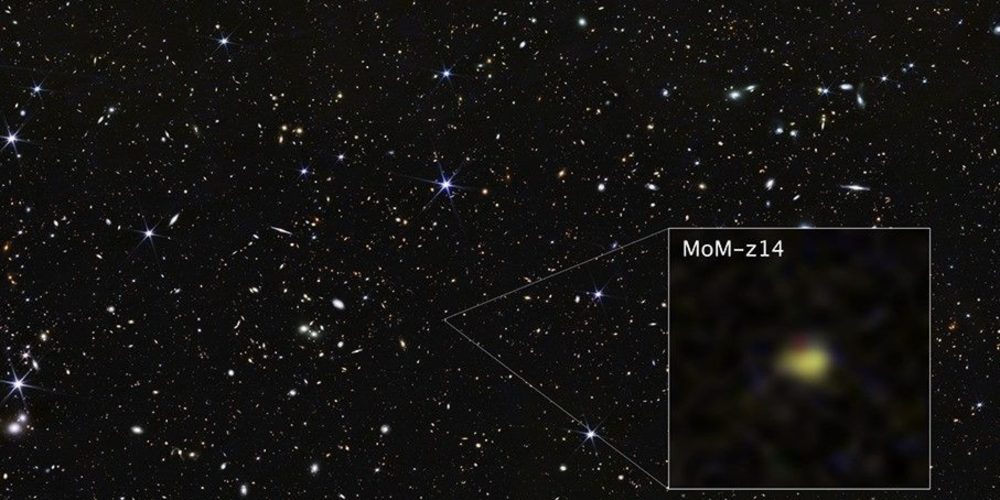 Naslovna slika: Galaksija MoM-z14 je trenutno najbolj oddaljena znana galaksija. Avtorstvo: NASA/ ESA/ CSA/ STScI/ Rohan Naidu (MIT)/ Joseph DePasquale (STScI)
